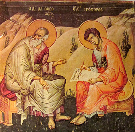 Fresque attribuée à Manuel Panselinos: Saint Jean le théologien dictant son évangile à son disciple Prochorus :