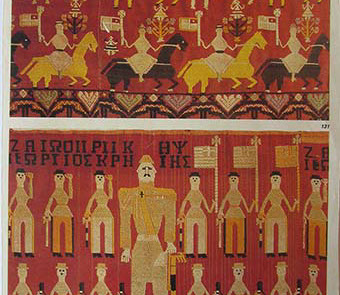 Je raconte en réponse à Hélène que depuis ma petite enfance, Péris m’avait également communiqué son attrait pour les arts textiles, m’offrant en toutes occasions des livres sur les broderies et les costumes grecs, sur l’art copte, des calendriers et des cartes postales du Musée Benaki, ainsi que des kourelloi jetés dans la rue et qu’il récupérait (tapis populaires constitués de bandes de tissus). Il m’a offert également un petit métier à tisser lorsque j’avais 7 ans, et un sac iranien tissé acheté dans une exposition. Il m’accompagnait presque chaque été au Musée Benaki et attirait mon attention sur l’origine géographique des tapis, en particulier ceux de Bursa, en Asie Mineure, sur la route de la Soie, haut lieu de production en matière de tissage au XV-ème siècle. Bursa étant la ville d’origine des Iérémiadis, en même temps que celle de Karaghiosis. Péris savait identifier l’origine de la plupart des tapis présentés-là, en fin connaisseur de la tradition du pourtour méditerranéen et surtout de l’Orient.