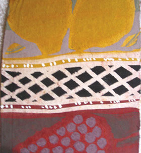 La toile, avec ses variations et ses méandres colorés, trouve bien sûr sa place conventionnelle dans les tableaux comme ceux des «couples» ou de la «femme couchée» (voir ci-contre). Mais en observant de plus près d’autres œuvres, il devient évident qu’elle change aussi de statut sur un plan symbolique: elle se métamorphose en vagues de la mer (peut-être pour exprimer le flux et le reflux du temps.), en air/souffle du vent (fond), en terre (les sillons), jusqu’à devenir la toile de fond du tableau, comme la métaphore du cadre de la vision de l’artiste, son rêve éveillé ou retrouvé, c’est-à-dire finalement le véritable sens du tableau, sa raison d’être. L’artiste nous donne à voir la chose, certes, mais aussi son propre regard.