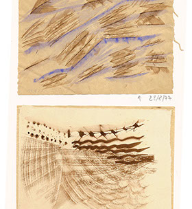 « Sommier », 2007 (pigment gratté, 62 ,3 x 50 cm.)  «(…) Fais de ta douleur une harpe. Et sois comme le rossignol, Et sois comme la fleur. Quand viennent les temps amers, fais de ta douleur une harpe, et chante-la. (…)» Kostas Karyotakis