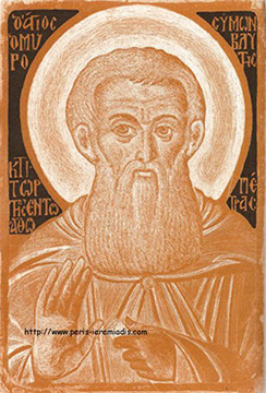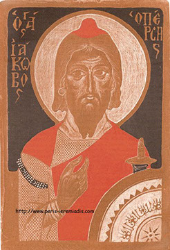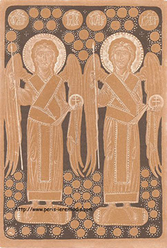 Quelques Saints (prophètes, anges, etc.) dessinés pour l'ouvrage «Le Synaxaire – Vies des Saints de l’Eglise Orthodoxe» (*), publié en 12 tomes par les Editions Indiktos en 2006. Ces portraits ont été réalisés selon la technique du "grattage" (terre et encre noire) sur des planches de bois. Ils révèlent une grande connaissance de l'histoire des icônes et de celle du portrait et s'appuient sur un important travail de documentation (représentations traditionnelles des Saints) ainsi que sur une étude approfondie menée depuis les années 1970 sur ce thème. Il emprunte à cette tradition (posture, traits, regards de l'éternité, symboles) tout en respectant sa démarche picturale singulière.